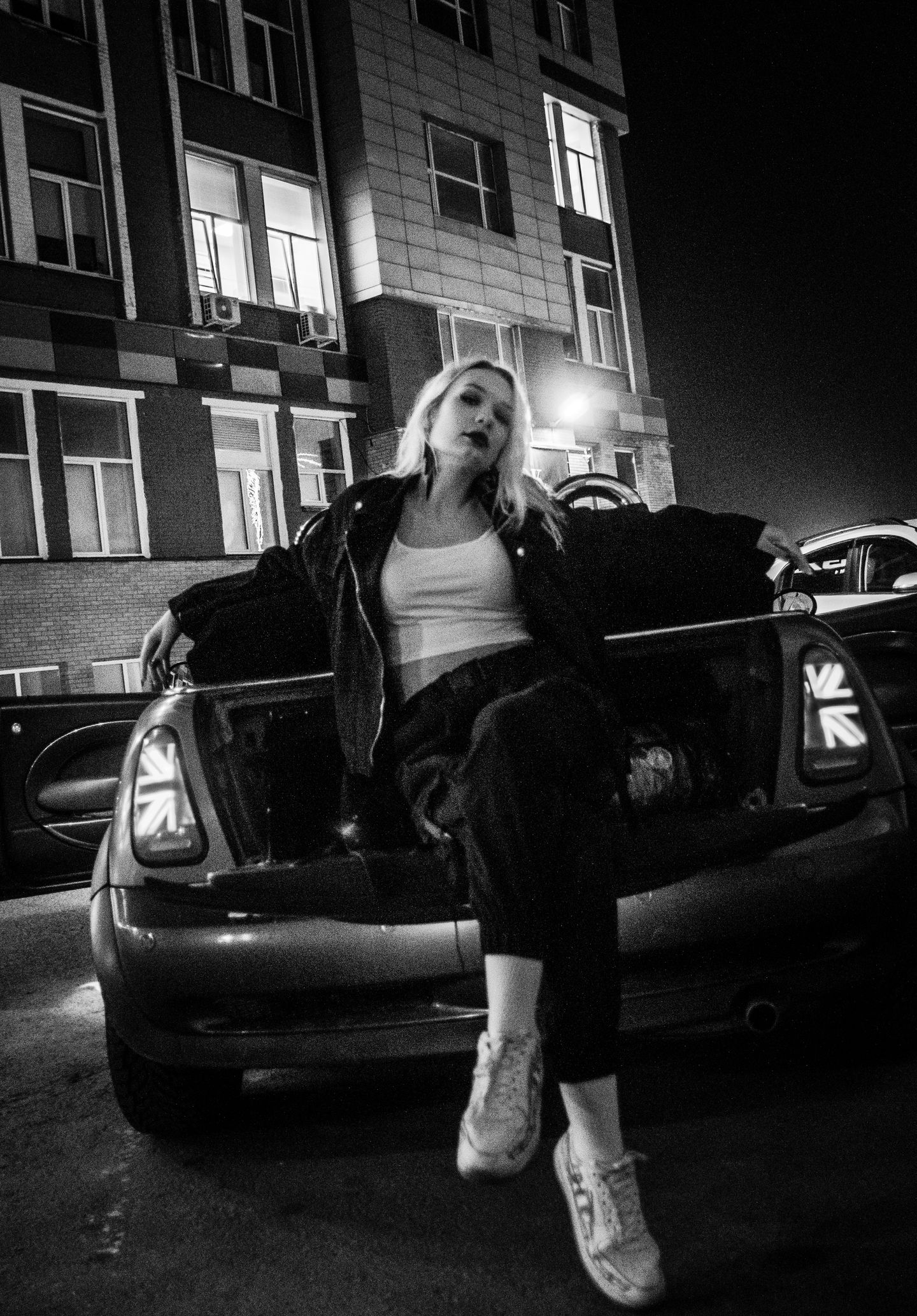 Ночная фотосессия с кабриолетом, черно-белая.